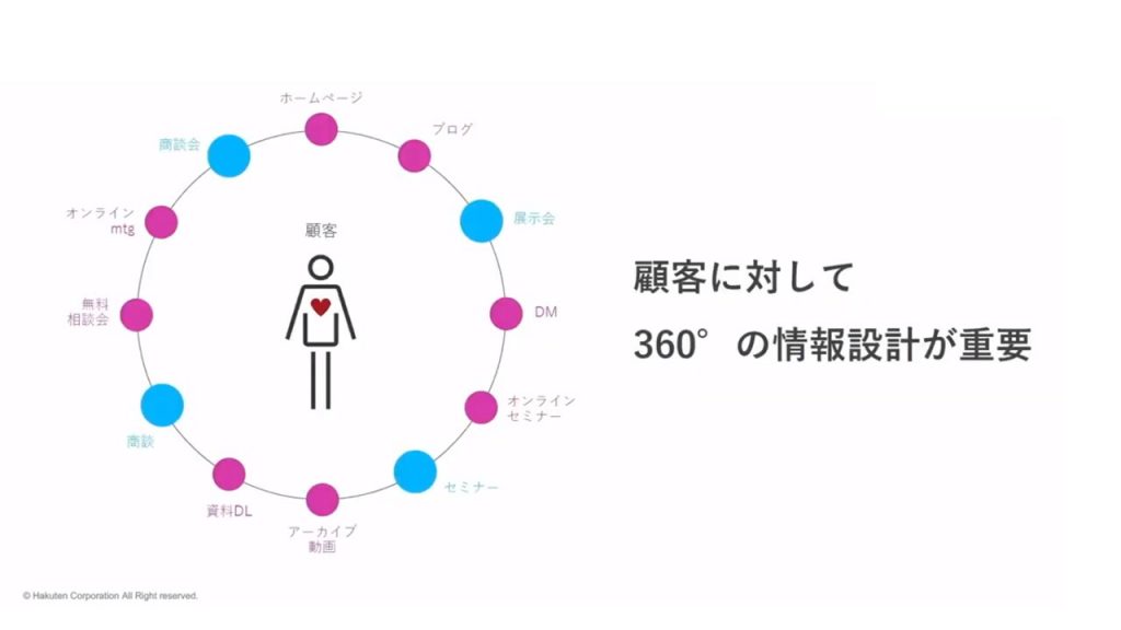 展示会やオンラインセミナー、アーカイブ動画、資料DLといった、オフラインの施策とオンラインの施策を組み合わせて顧客に対して360°の情報設計していくことが重要です。