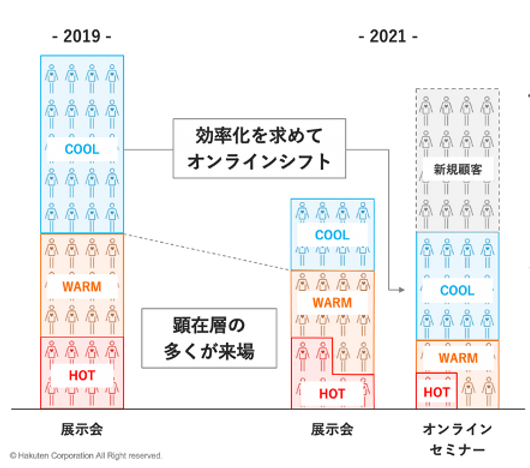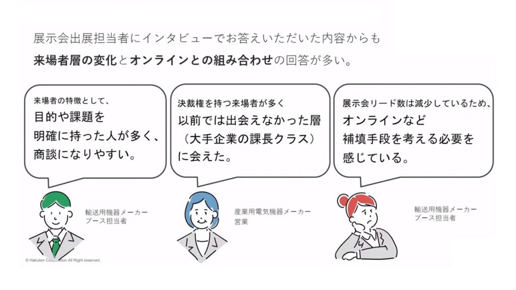 一方で、しっかり相談したい、中身を見ていきたいという顕在層の多くは変わらず来場していることで、展示会に訪れるホット層の比率が上がっています。