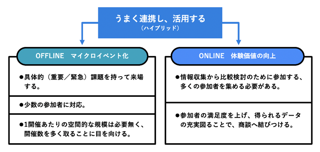 ハイブリッドでイベントを開催する際には、これらをいかに組み合わせて、設計していくのかが成功のカギですね。