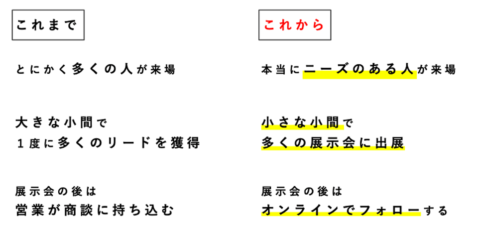 オフラインの展示会について、これまで、来場人数がKGIになることも多く、とにかく多くの人に来てもらうことが目標となっていました。