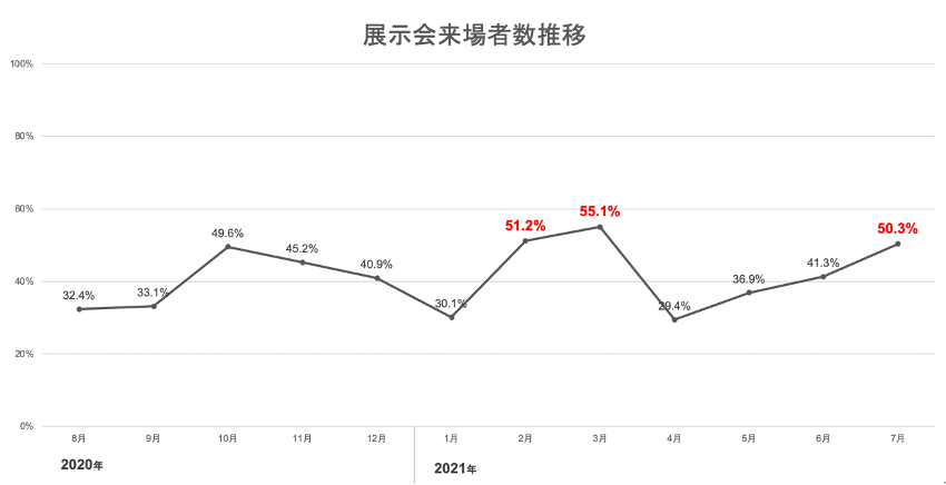 2021年の2月~3月には来場者数は55%に回復し、感染者数が延びたことで再び減ってはいたものの、7月には半数くらいまでには回復してきています。