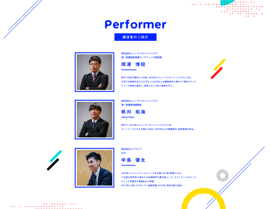 今回は50,000タイトル以上の実績を誇る、動画制作のプロである株式会社ヒューマンセントリックス様(以下HCX)を特別ゲストにお迎えし、スプラシア(以下SP)代表中島とオンラインイベントにおける動画コンテンツの企画方法から業界別の勝ちパターンをお伝えいたします!