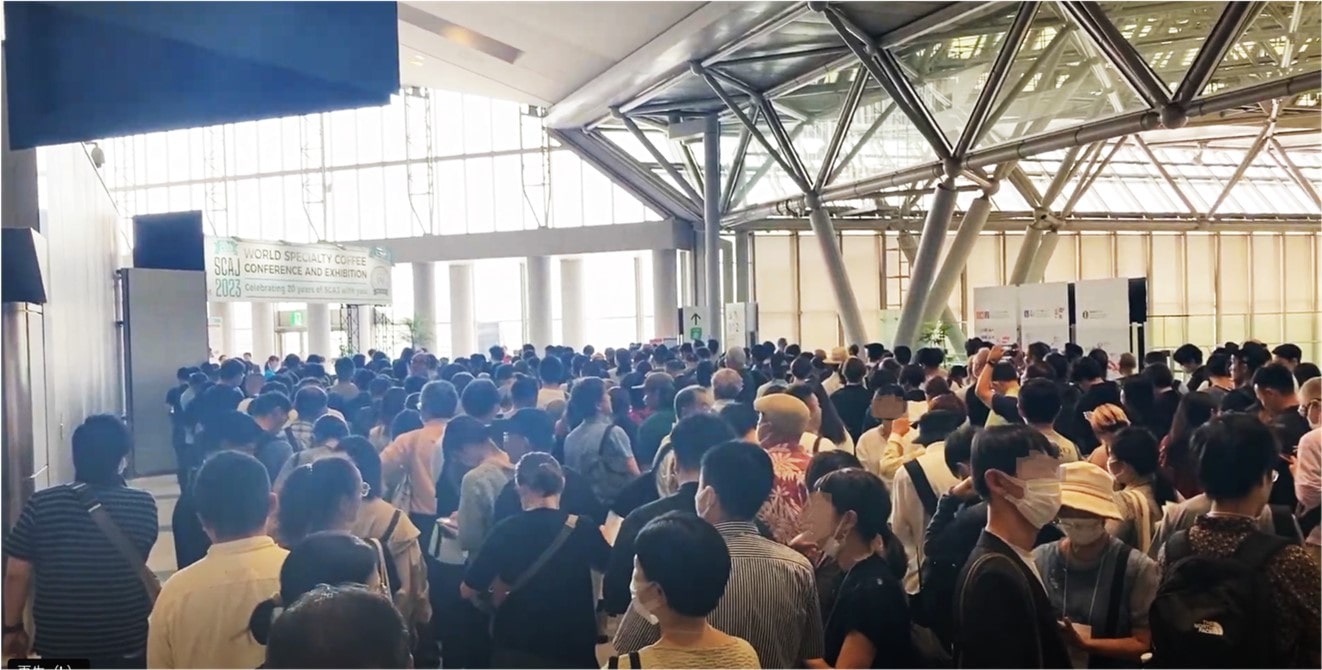 限定の試飲やセミナー参加などを求め、世界各国からこの日の為にコーヒービジネスに関わる人やファンがビッグサイトに人が集まる。