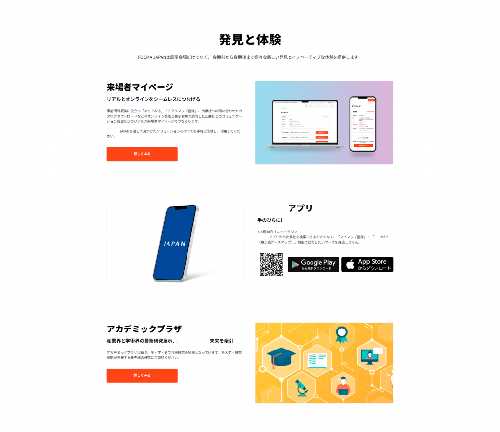 今回、事例としてお話しさせて頂く合同展示会をお手伝いさせて頂くのは今年が初めてだったのですが、我々は主に「公式サイト」「来場者向けアプリ」「出展者向けアプリ」「入退場管理システム」をご提供させて頂きました。各プロダクトで新しいチャレンジを多く行っているので、その点についてお話しできればと思います。